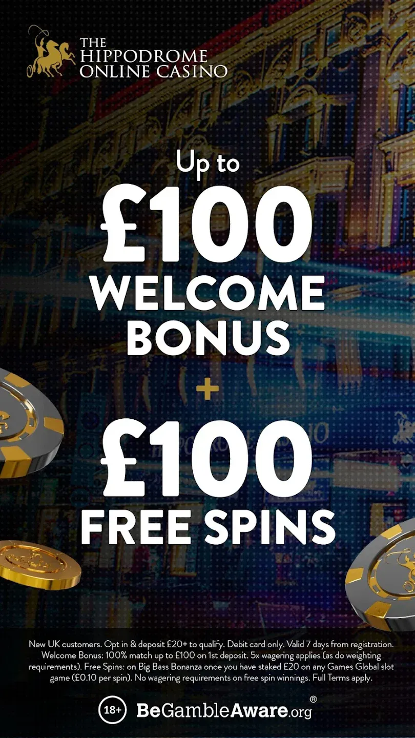 Join Hippodrome Online Casino today and receive a 100% Match Bonus on your first deposit (up to £100) plus 100 free spins on Big Bass Bonanza. Example = Deposit £100, receive a £100 bonus, play with £200. *Terms and Conditions apply.